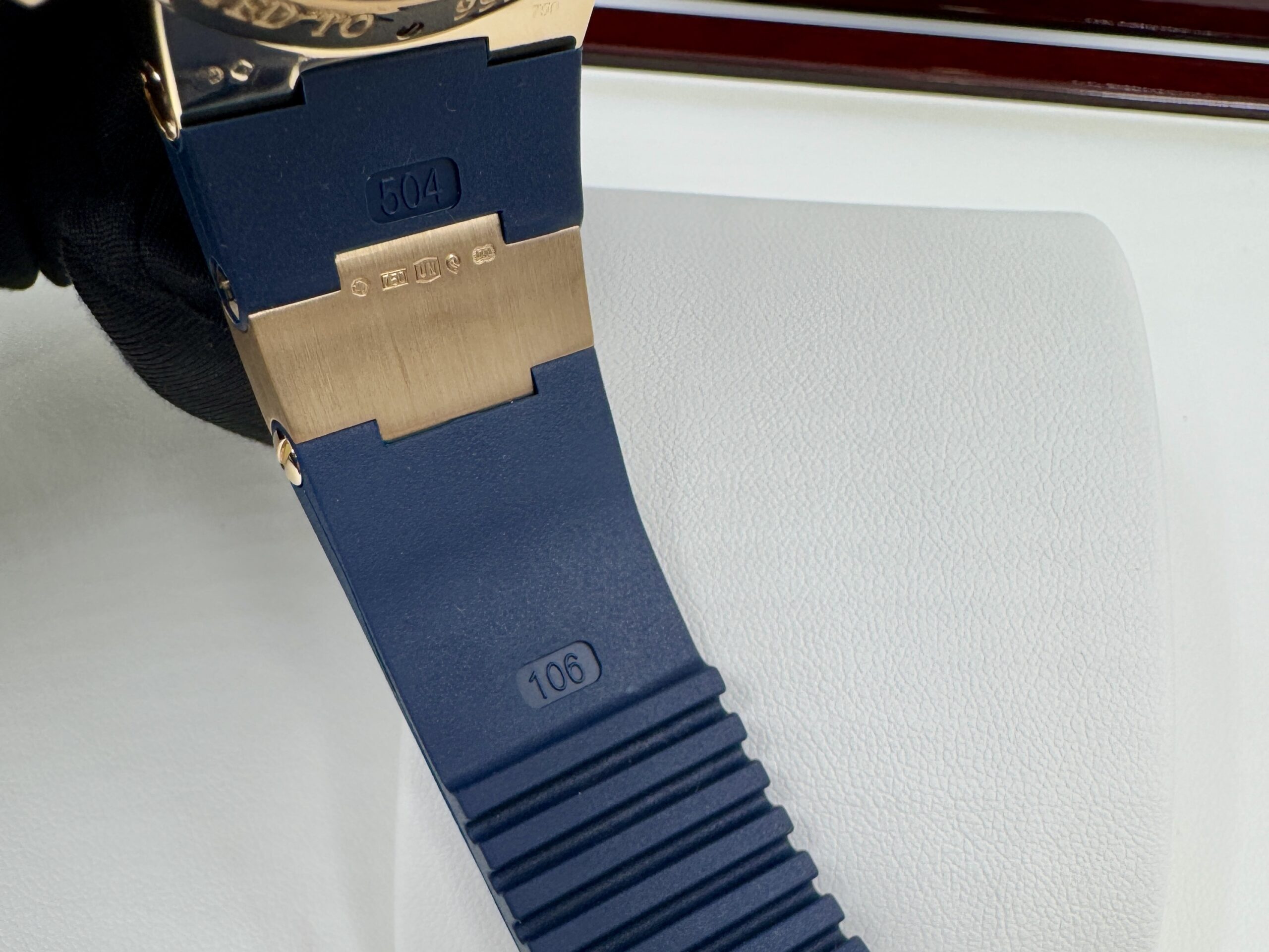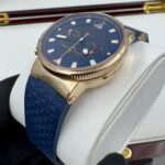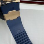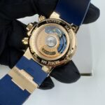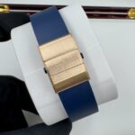 Циферблат защищен прозрачным антибликовым сапфировым стеклом, которое устойчиво к сколам и повреждениям. Задняя крышка также выполнена из сапфирового стекла, позволяя любоваться механизмом. Ремешок из каучука с золотой раскладывающейся застежкой гармонично дополняет образ.